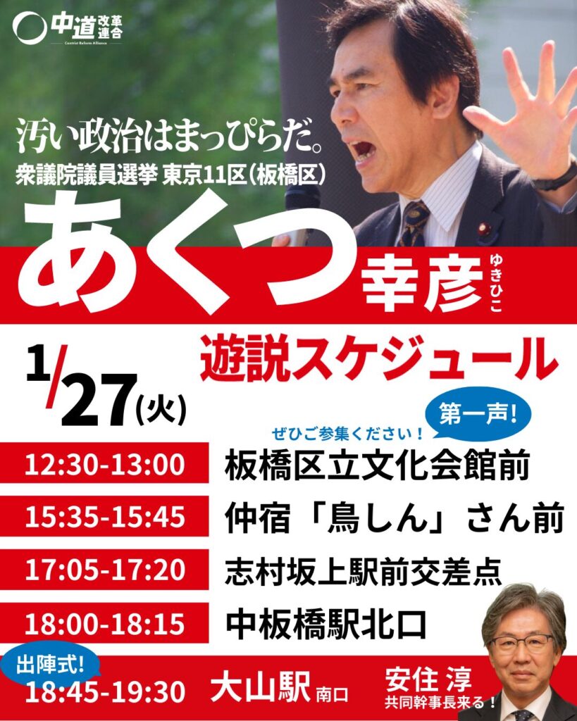 2026.01.27 12日間の選挙戦がスタートしました 選挙 その他 Tweet Share RSS いよいよ選挙戦が始まりました。 12日間の選挙戦で地域の皆様にはお騒がせしてしまいますが 限られた時間と手段を最大限に活用し、心を込めて活動いたしますので どうかご理解いただけますと幸いです。 あくつ幸彦本人は、本日午前板橋区役所前にて立候補の届出を済ませました。 この後12:30〜、大山駅近くの板橋区立文化会館前で第一声をあげます。 夜は大山駅南口にて出陣式。ぜひお立ち寄りください!(スタッフ) Tweet Share RSS 選挙, その他 私の決断 前の記事