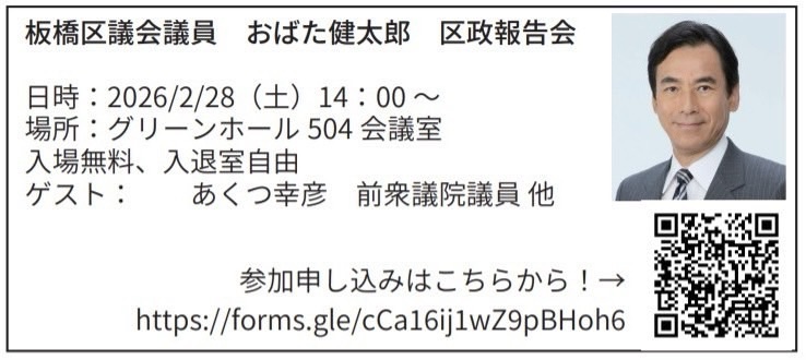 2026.02.27 おばた健太郎 区政報告会:あくつ幸彦も参加 Tweet Share RSS [おばた健太郎 区議 区政報告会] 急ぎのご連絡です。 おばた健太郎 板橋区議会議員が区政報告会を開催します。 私、#あくつ幸彦 も参加して、「総選挙報告」も行います。 ぜひ、ご参加を賜りますよう宜しくお願い致します。 日時:2月28日(土)14:00〜場所:グリーンホール504会議室 Tweet Share RSS その他 [あくつ幸彦 タウンミーティング〜総選挙報告会〜]のご案内 前の記事