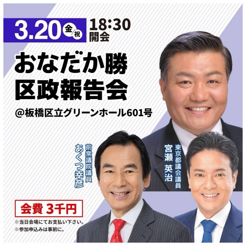 2026.03.20 まもなく 尾名高勝 区議 区政報告会 Tweet Share RSS 今日はこれから、#おなだか勝 #板橋区議会議員 の #区政報告会 に参加します。会費制で懇親会もありますが、パワーポイント資料を使った丁寧な「板橋区政報告」にご関心のある方は、報告会だけでもご参加ください。私も宮瀬英治都議も参加予定です。 Tweet Share RSS その他 東日本大震災の被災地「15年後の今」① 前の記事